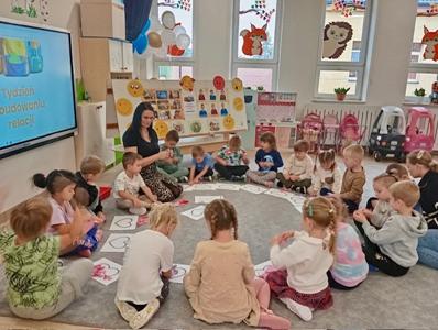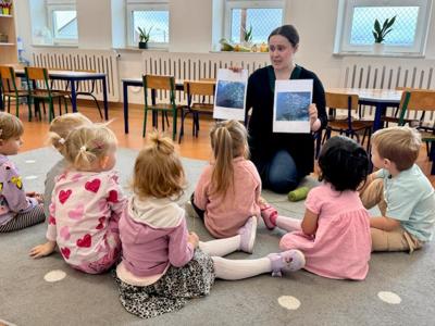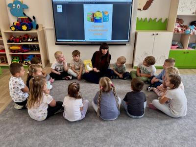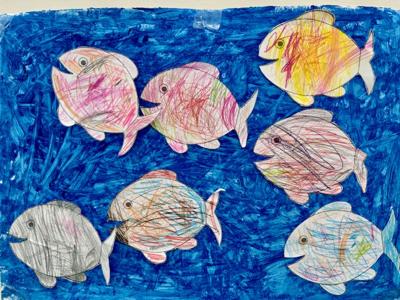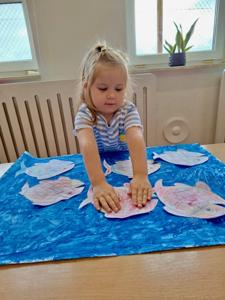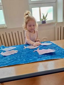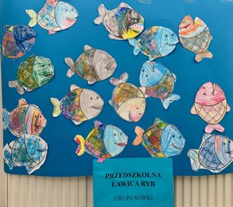 Na zajęciach z psychologiem pt. „W ławicy ryb” dzieci dowiedziały się, że tak jak rybki w ławicy płyną razem – bezpiecznie i zgodnie – tak samo grupa przedszkolna tworzy zgraną całość, gdy wszyscy współpracują i wspierają się nawzajem.