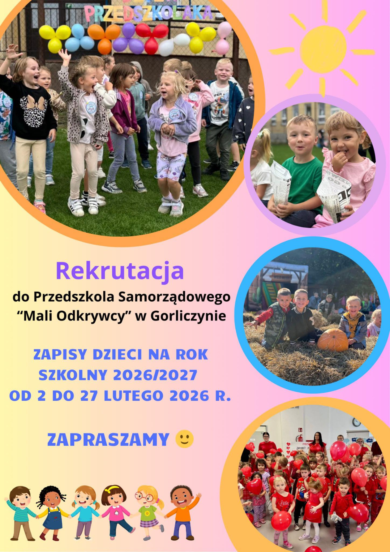 Dyrektor Przedszkola Samorządowego „Mali Odkrywcy” w Gorliczynie informuje, że zapisy nowych dzieci do przedszkola na rok szkolny 2026/20267 rozpoczną się 02.02.2026 r. i trwać będą do 27.02.2026 r.